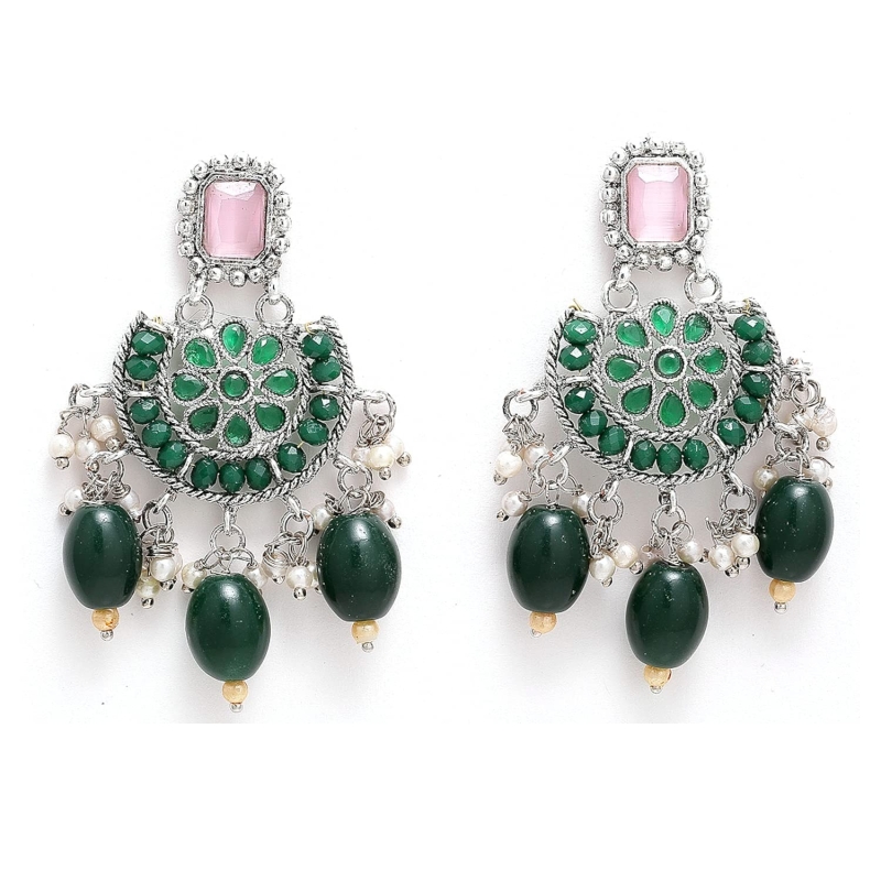 قلادة قلادة قلادة تقليدية مرصعة بالحجر باللون الأخضر والوردي مطلية بالفضة مع أقراط مجوهرات