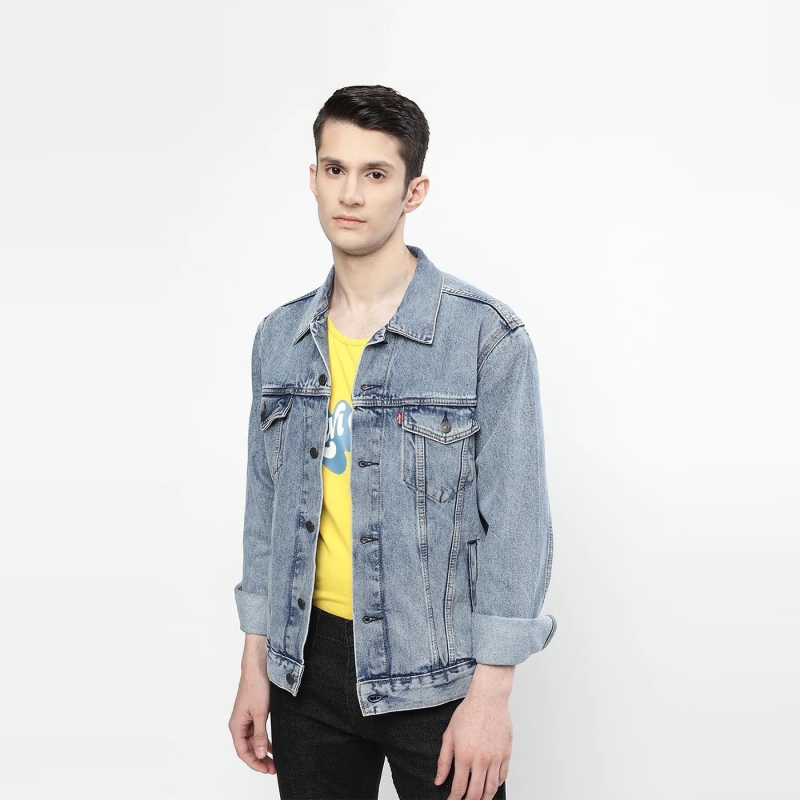 سترة سائق شاحنة من الدنيم بدون ماء مغسولة باللون الأزرق ، لها ياقة منتشرة ، 4 جيوب ، زر إغلاق ، أكمام طويلة ، حافة مستقيمة ، وبطانة قطنية.