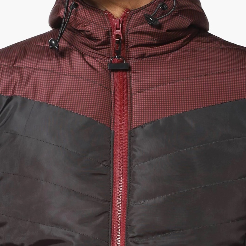 • Maroon and Black colourblocked jacket, has a hooded, 2 pockets, zip closure, long sleeves, straight hem, and polyester lining.